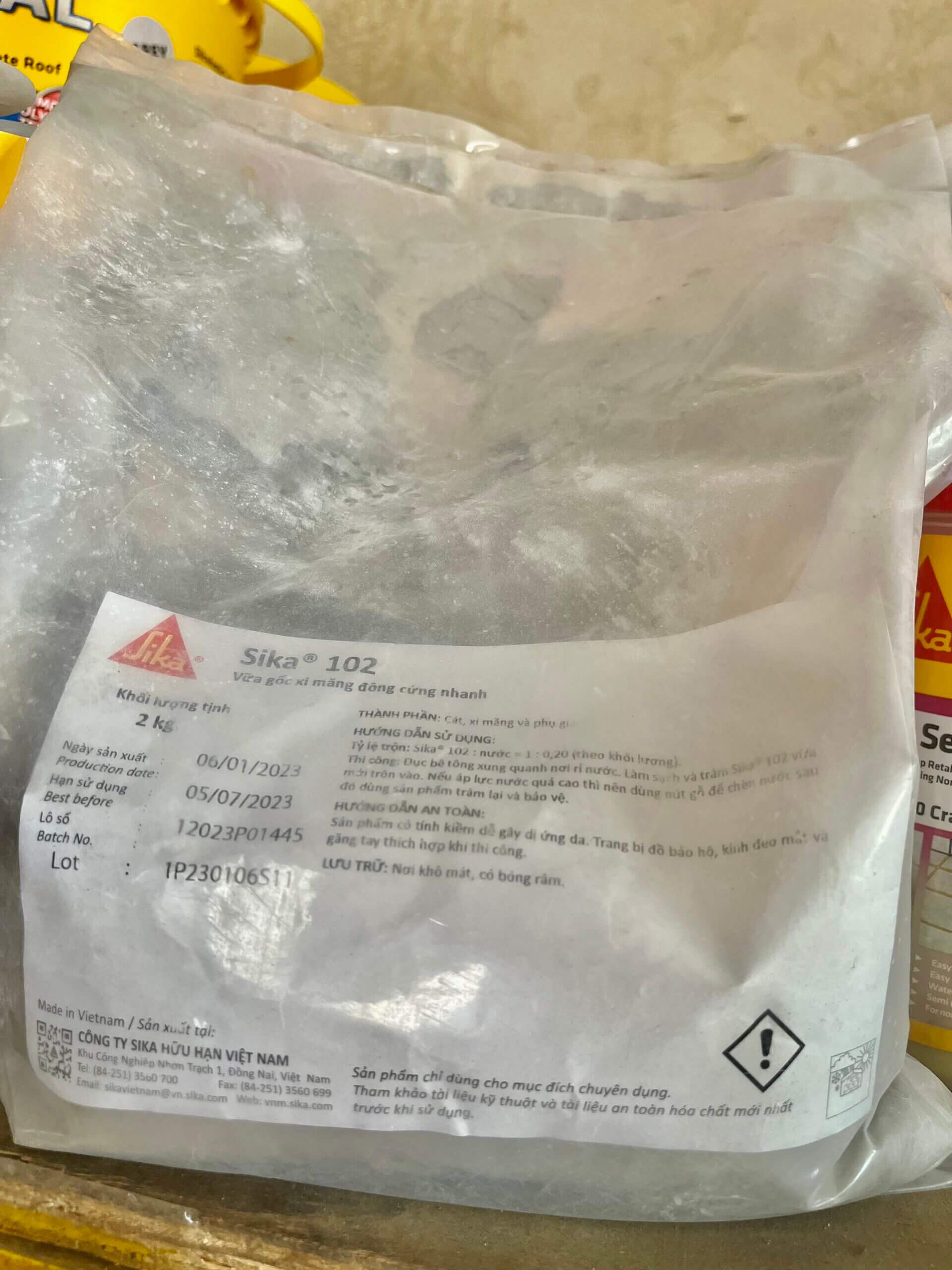 - Tỉ lệ trộn: Bột Sika 102 : nước = 1: 0.2 (theo khối lượng)