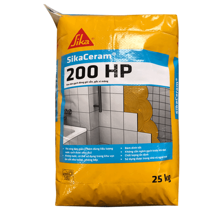 SikaCeram 200 HP là keo dán gạch gốc xi măng có khả năng kháng nước với công thức đặc biệt dùng để dán gạch cho sàn, tường trên bề mặt bê tông, nền vữa và các hạng mục trong nhà, ngoài trời. Sản phẩm được sử dụng cho các loại gạch men, gạch đồng chất, mosaic hay đá granite, đá marbles.